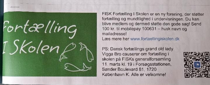 Foreningen FISK – Fortælling I Skolen holdt en velbesøgt generalforsamling den 11. marts i København. Der var stor og positiv opbakning til foreningens strategi og planer for aktiviteter i det kommende år. Vi arbejder videre med formålet: Fortælling I Skolen arbejder på at skabe og udvikle mundtlig fortællepraksis som en del af undervisningen i danske grundskoler.